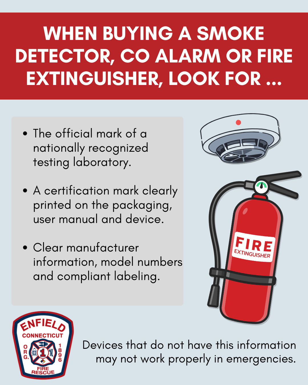 With a rising number of non-listed fire safety products being sold online and in stores across the state, Enfield Fire District No. 1 encourages residents to carefully inspect fire safety devices before purchasing. Non-listed fire safety products include smoke detectors, carbon monoxide alarms and portable fire extinguishers that have not been tested and certified by…