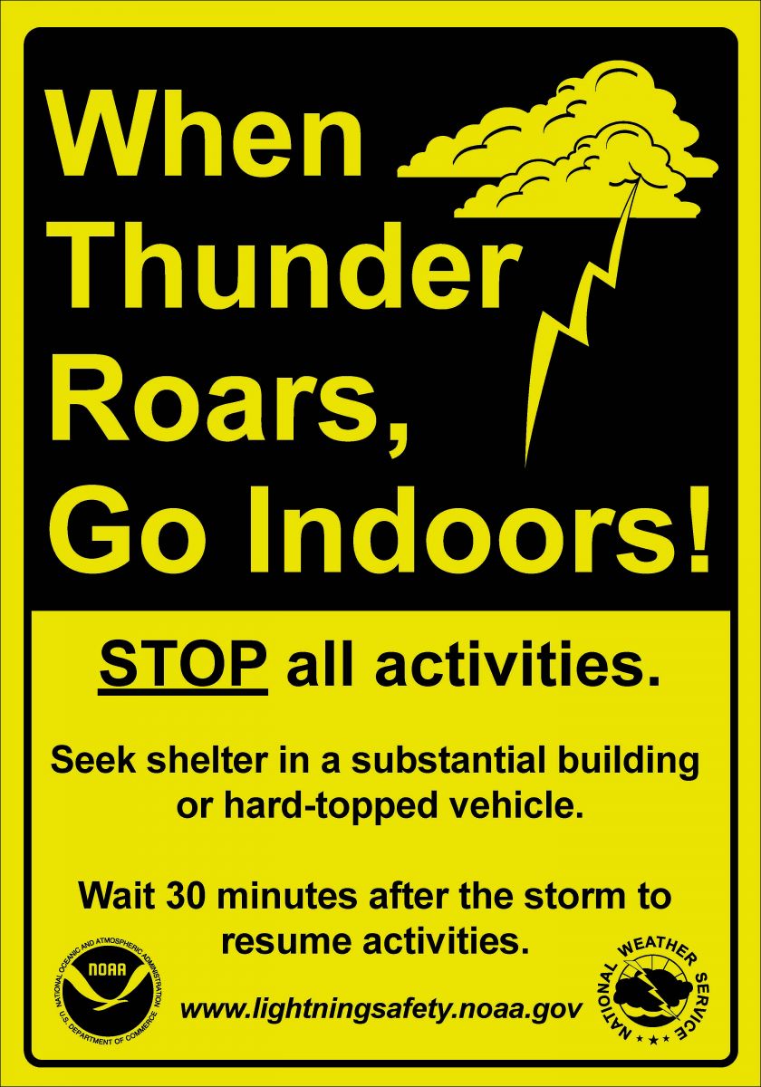 Be aware: Check the weather forecast before participating in outdoor activities. If the forecast calls for thunderstorms, postpone your trip or activity, or make sure adequate safe shelter is readily available.