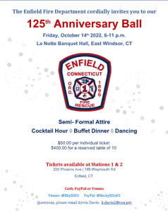 In celebration of Enfield Fire District No.1’s 125 anniversary, the department will host an Anniversary Ball for those wishing to celebrate alongside members of EFD.